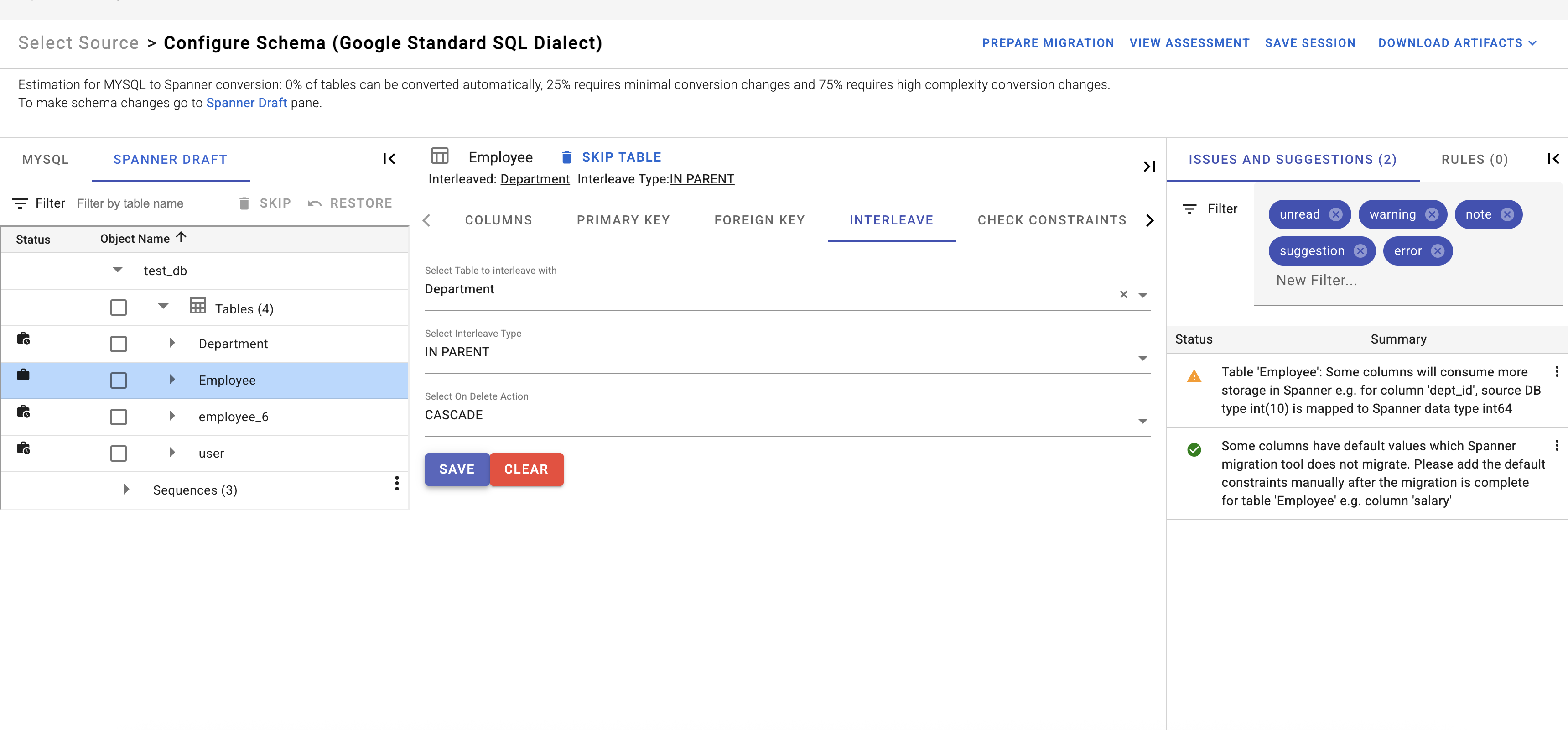Interleaving physically co-locates child rows with parent rows in storage. Co-location can significantly improve performance.For example, if there is a Customers table and an Invoices table, and the application frequently fetches all the invoices for a customer, users can define Invoices as an interleaved child table of Customers. In doing so, a data locality relationship between two independent tables is declared resulting in significant performance improvement. Spanner Migration Tool provides the option to convert a table into an interleaved table by providing the intended parent table if it fulfills interleave requirements. Once a table is converted into an interleaved table, the UI shows the information of the parent table. Users can also choose to remove this interleaving property. Currently Spanner Migration Tool allows users to choose between INTERLEAVE IN feature that allows child rows to be inserted without parent being present or INTERLEAVE IN PARENT feature which maintains the referential integrity. Users have to choose the ON DELETE action for INTERLEAVE IN PARENT setting. The INTERLEAVE IN feature leads to a faster migration. After the migration is completed, users need to modify the DDL to shift from INTERLEAVE IN to INTERLEAVE IN PARENT so that the check for parent and child rows can be inforced.